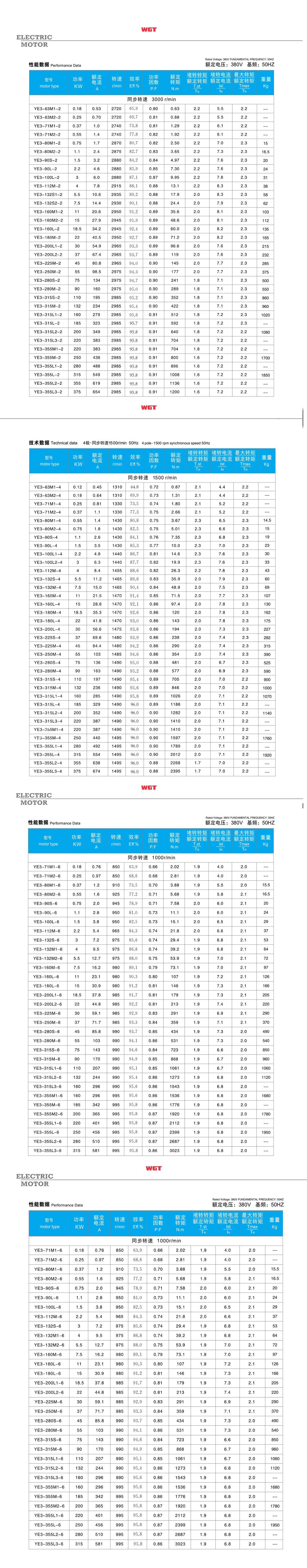 Technical Data: Centre height of frame: 80-355mm Power range:0.55-315kW Rated voltage:380V or order Rated frequency:50Hz or 60Hz Protectionclass:IP54orIP55 Insulation class:F Duty type:S1